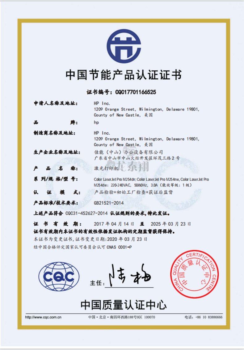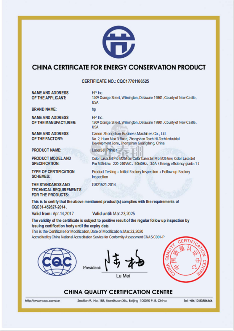 • 節(jié)能產(chǎn)品證書編號:CQC17701166525
