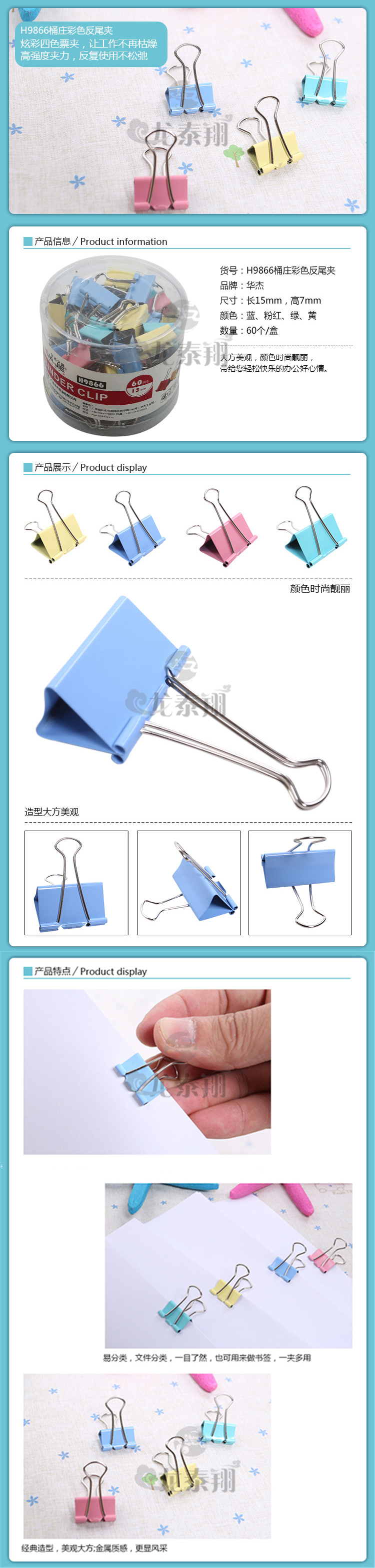 自營華杰 H9866 長尾夾 15MM-60個/筒/彩色 單位:筒